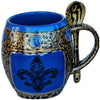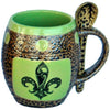 Single 14 Oz. Mug with Spoon with Fleur De Lis Design and Avocado Green, Blue, Coral, or Yellow Glaze.