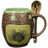 Single 14 Oz. Mug with Spoon with Pinecone 1 Design and Avocado Green, Blue, Coral, or Yellow Glaze.