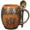 Single 14 Oz. Mug with Spoon with Trio Kokopelli Design and Avocado Green, Blue, Coral, or Yellow Glaze.